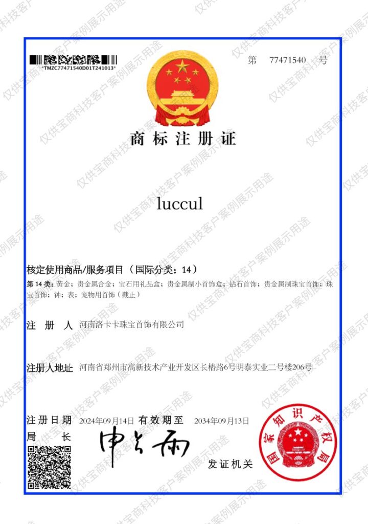 商标名称:luccul 商标类型:文字商标 商标类别:14 珠宝钟表 ( 10小项 ) 注册号:77471540 1401 :黄金 140104 贵金属合金 1402 :宝石用礼品盒 贵金属制小首饰盒 1403 :钻石首饰 贵金属制珠宝首饰 140050 珠宝首饰 1404 :140011 钟 140057 表 1405 :140187 宠物用首饰
